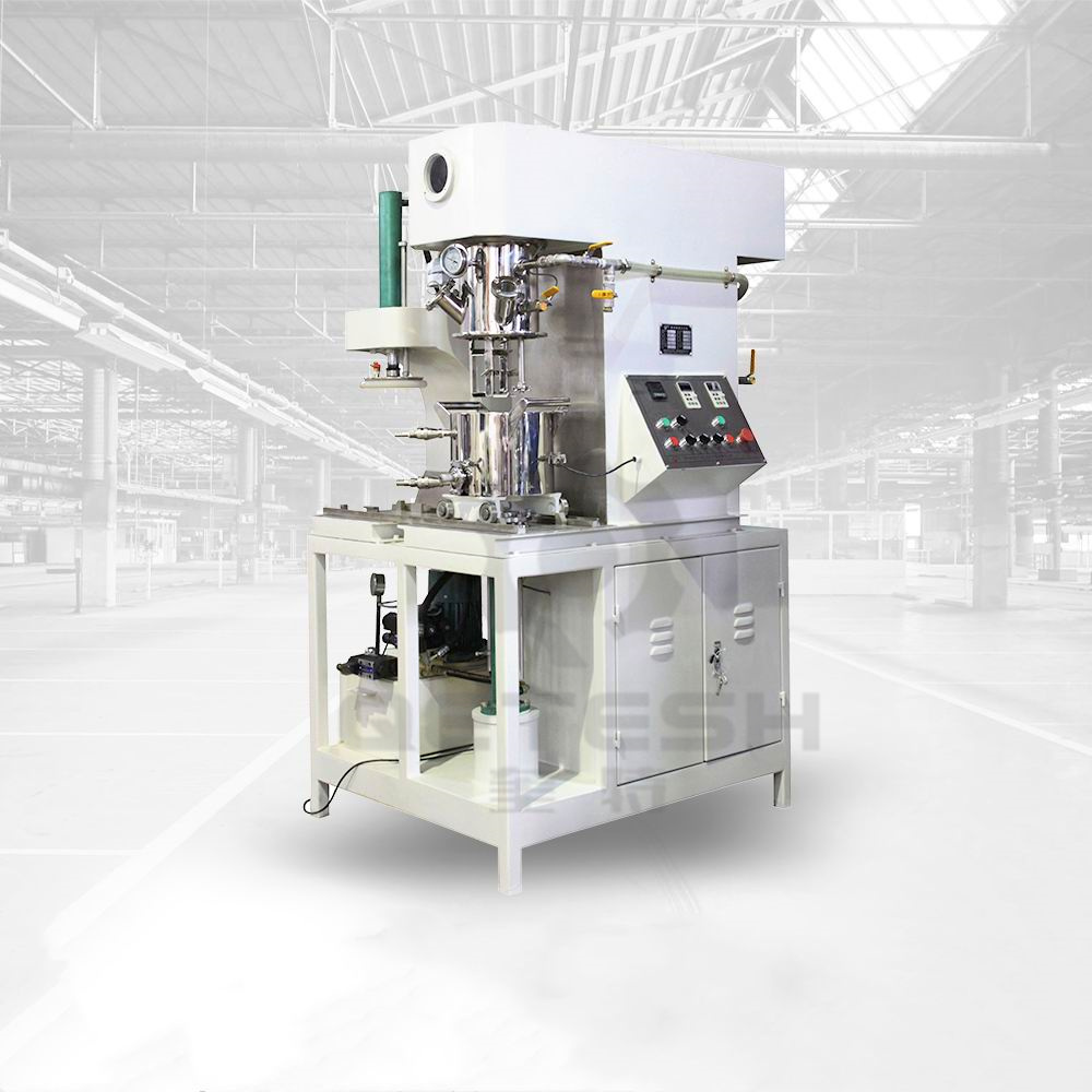双行星动力混合机是一种新型且对多种混合液体、粉体进行搅拌、溶解、分散、均质的搅拌设备。该设备配有高速、低速、活动刮板部件,低速搅拌部件采用行星齿轮传动,搅拌桨在公转时也自转,使物料上下及四周运动,从而在较短的时间内达到理想的混合效果。高速分散/乳化部件与行星箱一起公转,同时高速自转,使物料受到强烈的剪切与分散混合,罐体内壁为大型立车精加工,再经大型抛光机自动抛光,确保行星箱上的活动刮刀在旋转时,把罐体内壁上的物料完全刮掉,其混合效果是普通混合机的几到几十倍。广泛应用于电池、有机硅胶、高端油墨、染料、粘胶剂、高端高粘度涂料等化工产品的生产。